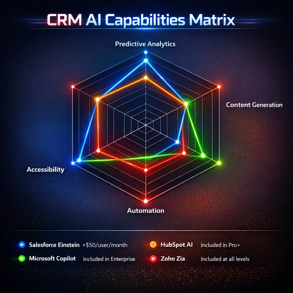 Salesforce Einstein offers the most mature AI capabilities but at premium pricing. Lead scoring, opportunity insights, and predictive forecasting work well but require quality data and proper configuration.