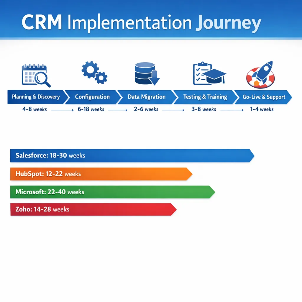 Salesforce implementations typically span 4-9 months for mid-sized businesses. The complexity requires thorough planning, data modeling, and phased rollouts. Rushing implementation leads to poor adoption and expensive rework.