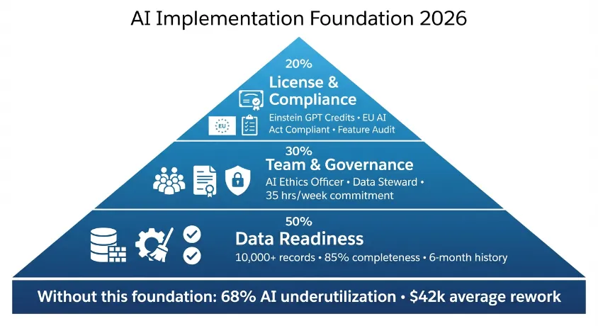 The 2026 AI landscape has evolved beyond simple feature activation. With the integration of Generative AI (Einstein GPT) and new EU AI Act compliance requirements, setup is now a strategic investment requiring careful planning. This checklist ensures you avoid the common pitfalls that cost businesses an average of $42,000 in rework during AI implementation.